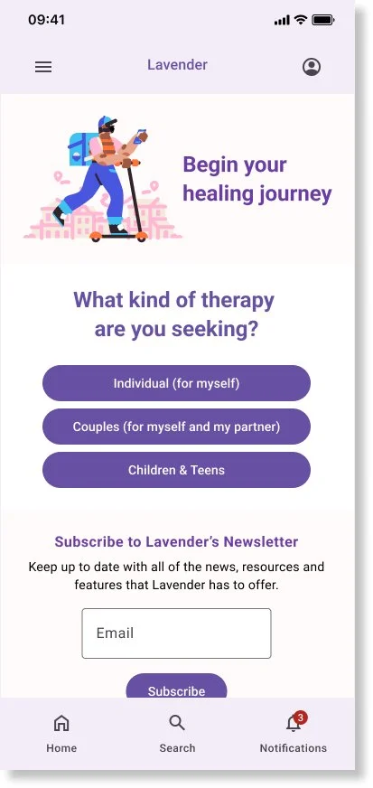This user group confirmed initial assumptions about the Lavender Therapy customers, but research also revealed that it is very important to users to narrow down the search for a therapist through a questionnaire or a quiz.