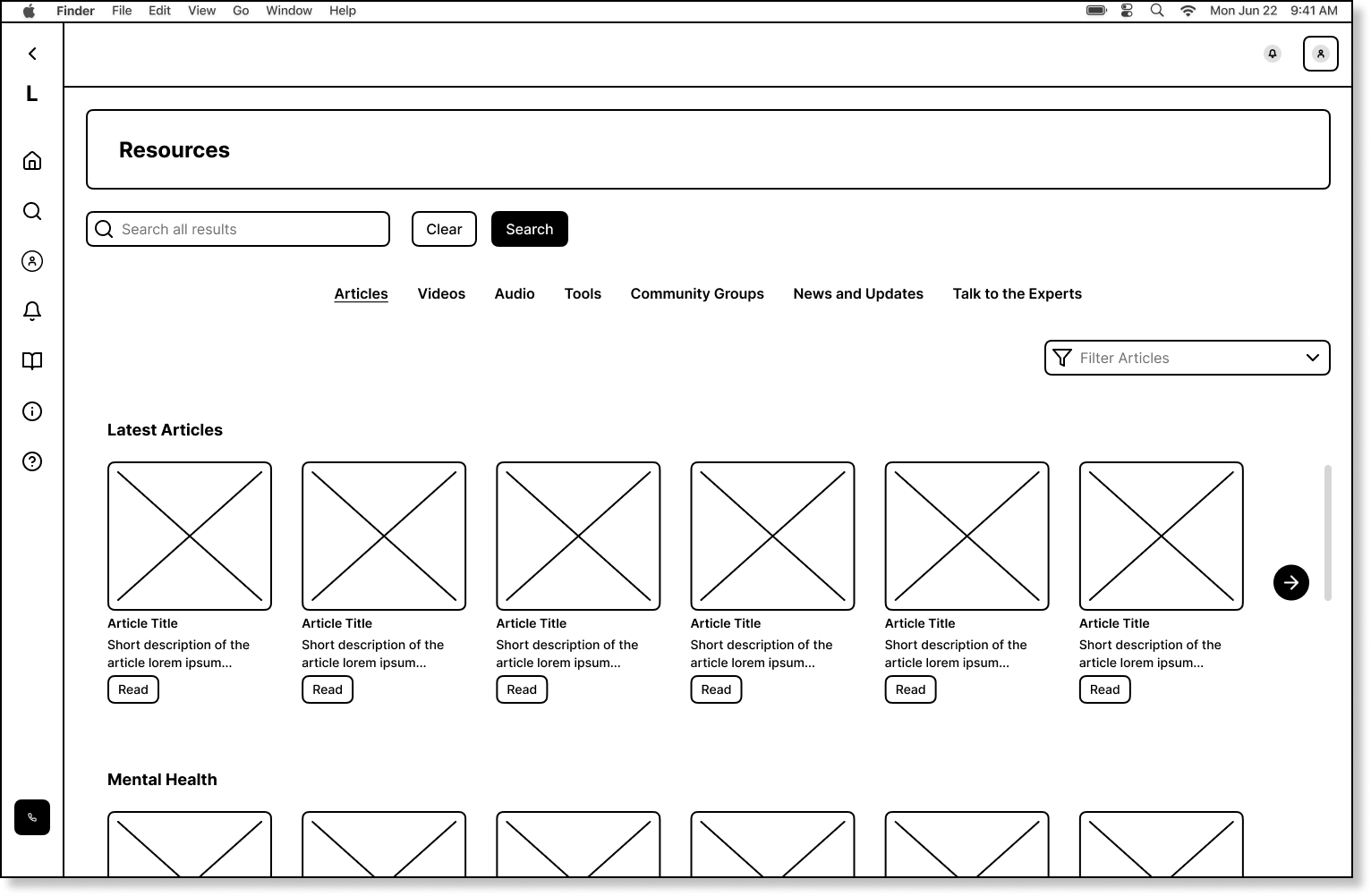 A minimal layout with large text and buttons are ideal to allow the users to easily find the resources they need without feeling overwhelmed or distressed.