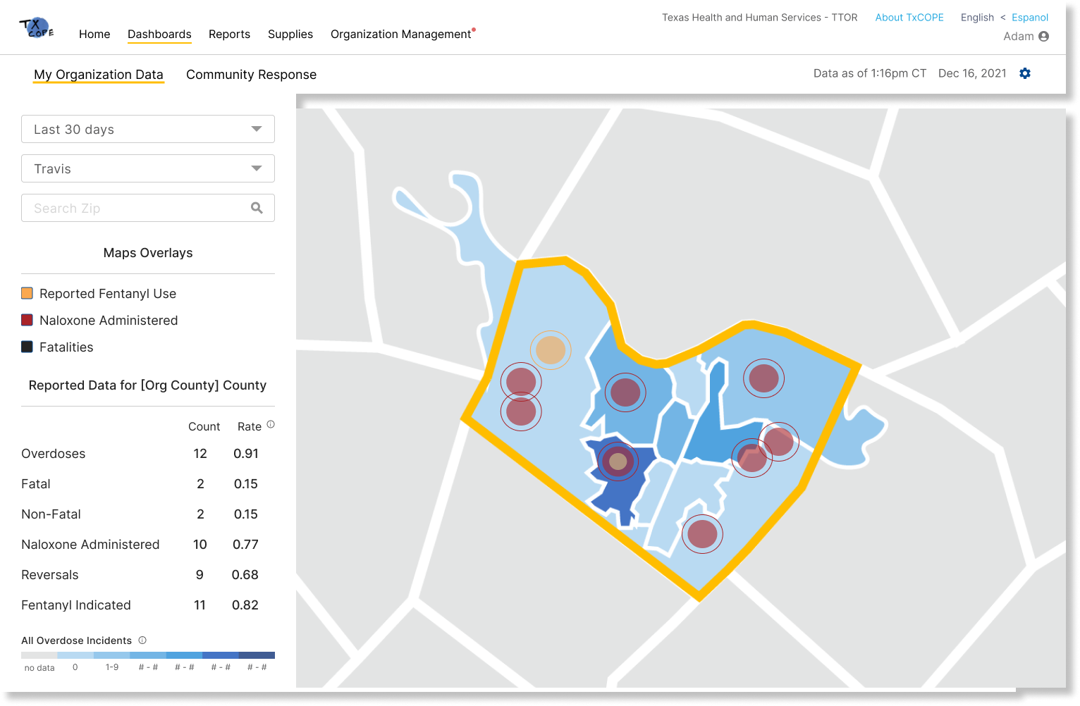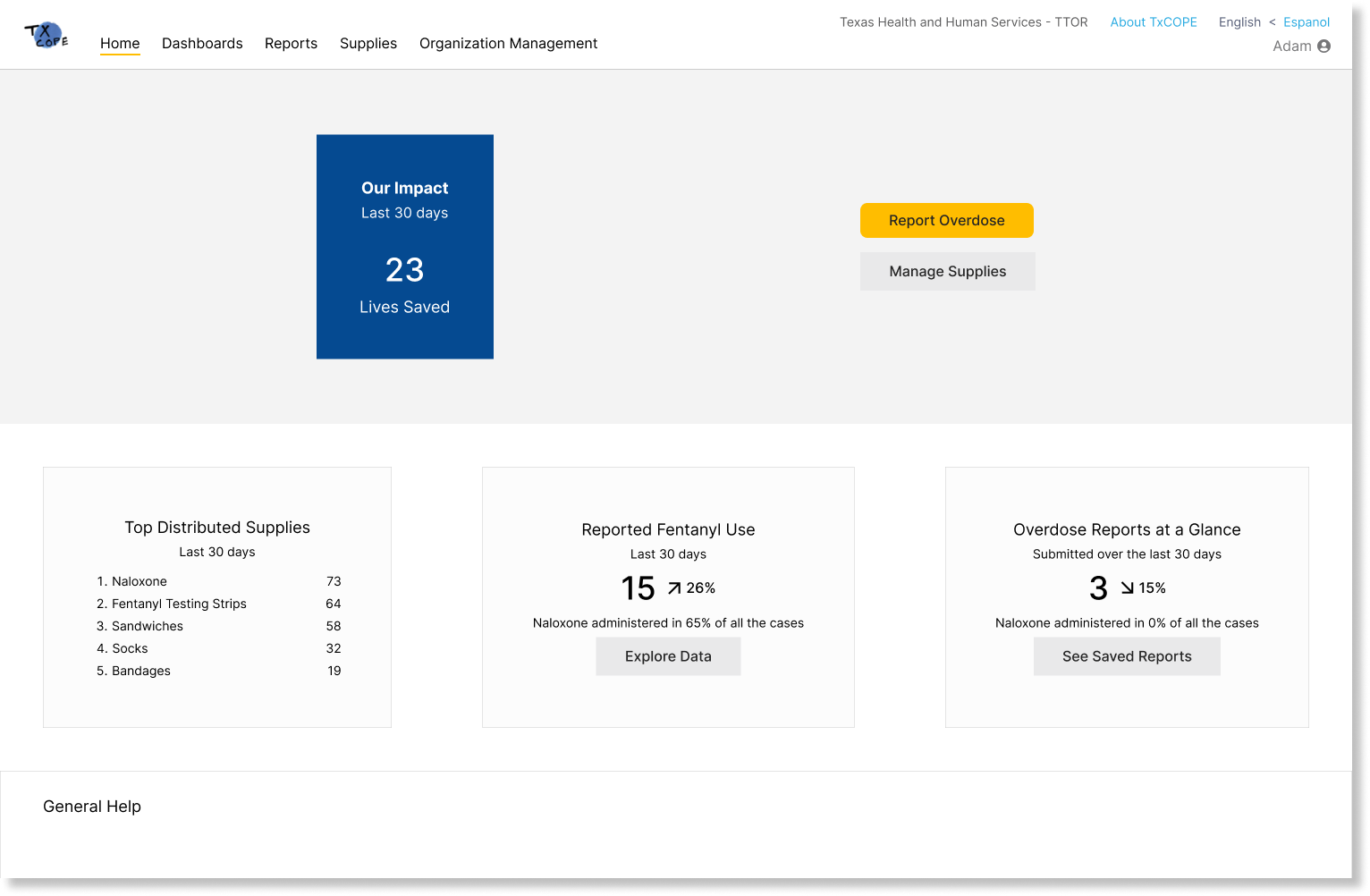 I was brought onto TxCOPE as the Lead UX Designer. I joined this project after it had organically grown and evolved over several years. This platform was created for the community by the community with the goal of improving opioid overdose response and prevention efforts and support organizations with data and tools for their outreach activities.